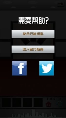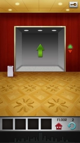 点击开始按钮,就能进入第一关。眼前是一扇电梯门,下方有四个方框,这些是用来放置道具的——有些关卡里捡到的道具就可以存放在这里。右上角有一把钥匙,它算是个作弊工具,不管处于哪一关,只要点击这把钥匙就能直接打开电梯门进去,不过遗憾的是,它只能使用一次。第一关的难度极低,操作和我们平时乘坐电梯没什么两样:按下那个向上的绿色按钮,电梯门就会开启,随后电梯上升,这样就顺利通关了。
