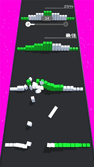 《彩球碰撞大作战》设计了丰富的关卡,玩家需操控小白球撞击场景里的其他彩球和积木,借助击打碰撞的方式为自己开拓出一条通路。游戏会自动保存玩家的进度,玩家能通过持续碰撞打开突破口,粉碎场景中搭建的各类模型。此外,游戏内还有超多不同造型的积木会阻挡玩家前进,玩家需要精准把控白球的角度与力度,经过多次尝试后才能抵达终点。