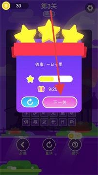 进入关卡后,留意图片中的线索,从下方的字库中挑选合适的字,组合成与线索对应的成语(例如“一日千里”)。