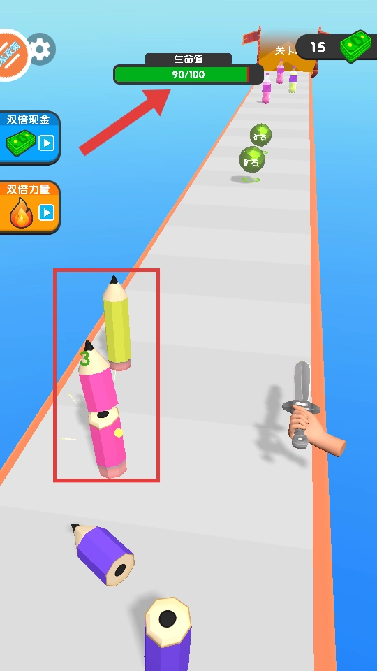 游戏启动后,控制角色向前移动,留意避开赛道上像【彩色铅笔】一样的障碍物,防止生命值减少。