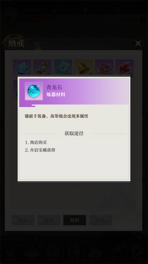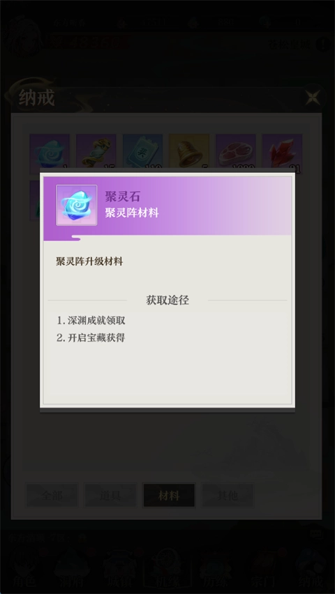 强化石是强化装备的材料,主要通过“机缘”装备分解获得,其他玩法也有部分产出;洗练石是洗练装备随机属性的材料,属性品质从低到高依次为绿蓝、紫、橙、红,普通洗练石洗练属性随机,主要通过“机缘”杀怪获得,高级洗练石洗练必出橙色品质,通过“机缘”触发转盘获得,极品洗练石洗练必出红色品质,通过活动产出;宝石可在每件装备解锁的4个孔位中升级,等级越高属性词条越多、数值越高,升级材料通过活动产出;功法点是升级功法的必须材料,通过“无尽深渊”获得,通过的关卡每天可进行扫荡;聚灵石是提升聚灵阵的材料,通过“无尽深渊”“每日任务”获得;卷轴是开启宝箱消耗的材料,分普通和高级两种,普通的主要通过“历练”几率掉落,高级的通过活动产出。