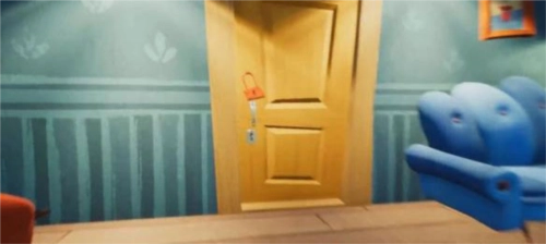 拿到蓝色桌子上的钥匙,去往一楼客厅,打开蓝色沙发旁边的黄色门,进入地下室。
