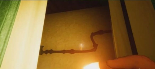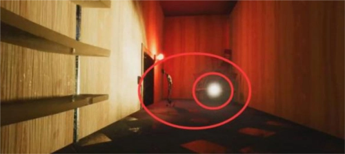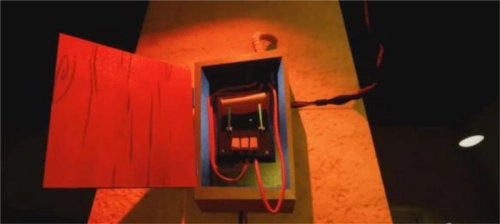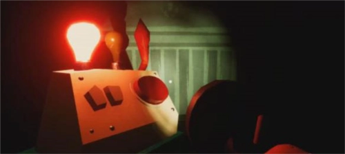 继续往前走,走到尽头时,在一个人偶旁边能拿到手电筒。接着走到尽头的屋子,屋内有扇铁栏门打不开,旁边有台发动机,不过通往发动机的门正在漏电。