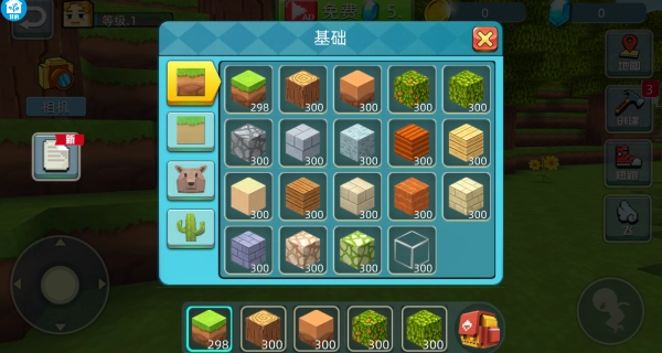 点击“基础”选项,这里陈列着各式各样的方块,不过建造它们需要消耗金币。
