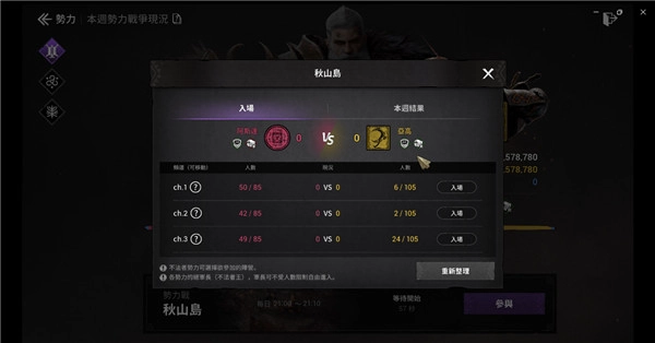 势力战每天早上9点开始,持续10分钟。比赛分多个频道进行,每个频道容纳上限为190人。玩家可自由选择频道并入场,也可以在战斗中切换频道,但需等待较长的冷却时间。初期建议选择己方人数较多的频道以增加获胜几率。势力战结束后,根据势力分数排名和胜负发放奖励,即便失败也能获得一定的BUFF与积分。