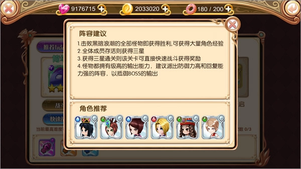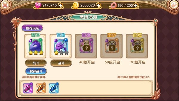 黑暗浪潮15级开启,每日0点重置,每天可打三次,如果通关3颗星就可以选择快速战斗,略过战斗过程为你节省更多时间。