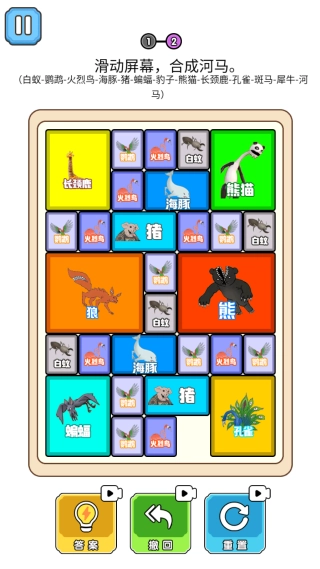 在疯狂动物华容道模式里,玩家需要移动不同动物的方块,通过合并让它们进化,只要最终成功合成孔雀就能完成关卡。