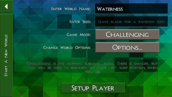 点击“new world”后,我们需要对创建世界进行自定义设置,完成设置后点击“setup player”
