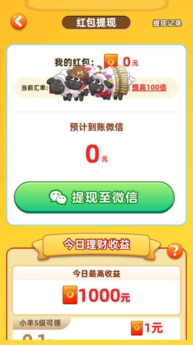 今日最高收益为1000元红包,小羊5级可领1元红包,小羊20级可领2元红包,小羊57级可领300元红包,小羊60级可领1000元红包。
