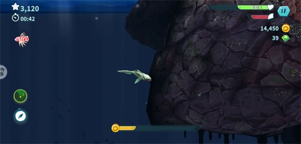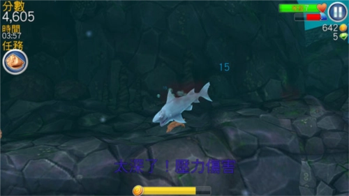 4、完成50个任务,寻找宝物取得金币与宝石,用来升级你的鲨鱼或者购买特殊救生道具。