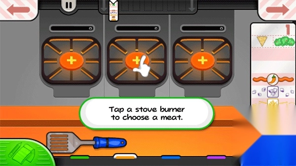 先到点餐处接收顾客的订单,接着转去烧烤区制作餐食,做好后将食物翻转过来铺在玉米饼上。