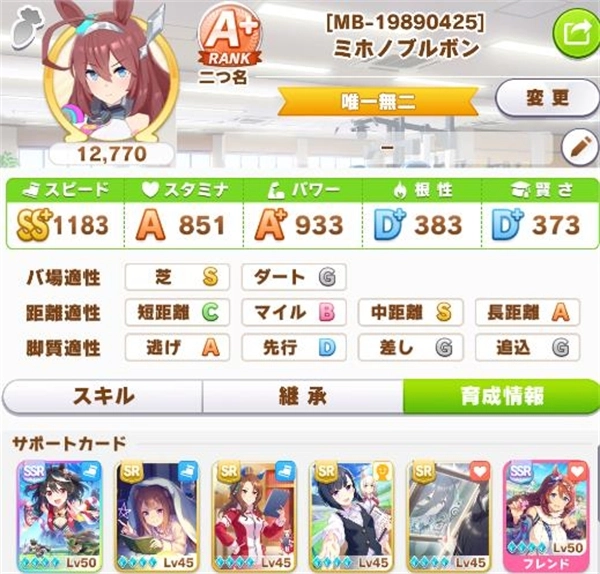 2、当玩家每种速耐力卡都能拿出2-3张属性不错的SR或SSR时,就差不多进入进阶期了。这个阶段,通关URA对玩家而言已属较简单的任务,马娘基本都已觉醒3或以上,重心也逐渐向竞技场或大赛转移。3速2耐1友的卡组配置,基本能应对所有主流中长距离赛道;速特速东商速光环都是相当优秀的平民速卡,速荣进闪耀也不错,更适合差马使用。