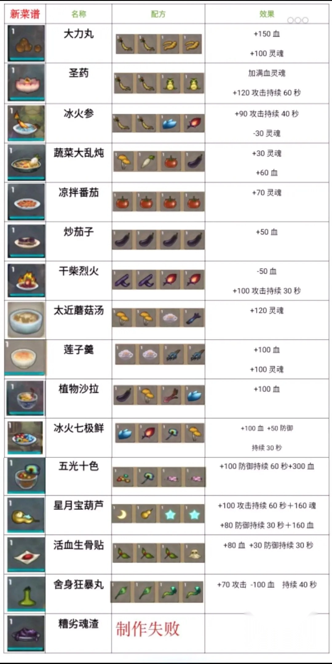 以下是灵魂岛各类食材的制作配方: