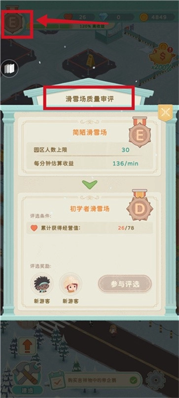 在主页面的左上角能看到你的滑雪场质量审评结果,好好提升你的滑雪场,争取成为一名出色的老板。