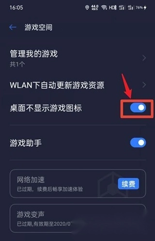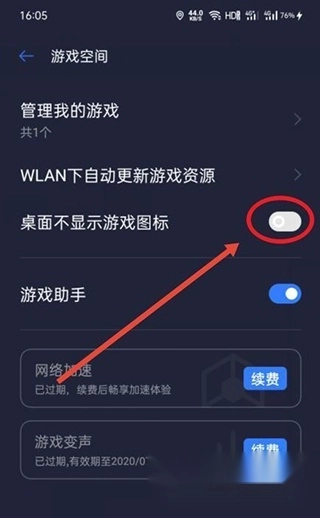 添加完成后,进入游戏空间界面,找到并点击“桌面不显示游戏图标”这个开关按钮。