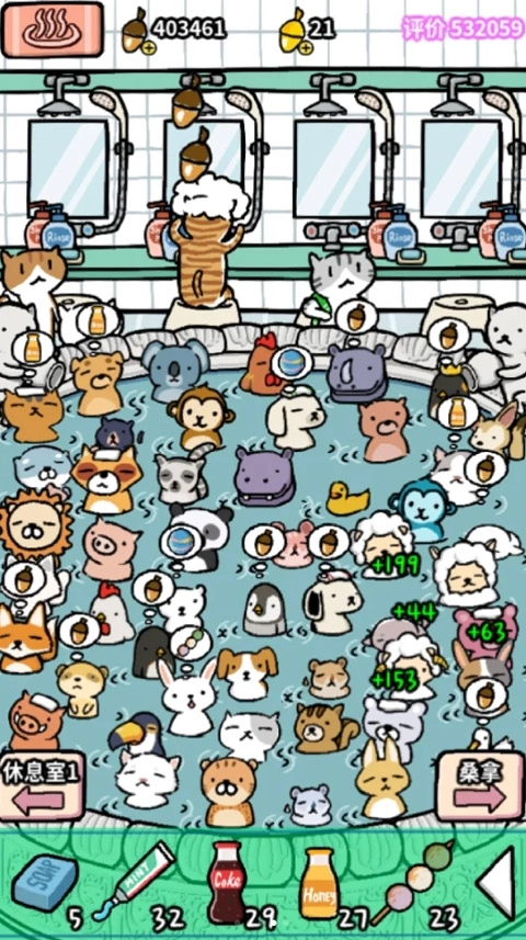 动物温泉中文版是一款竖屏的治愈系模拟经营游戏,你要做的就是经营一家温泉馆,招待各种来泡澡的小动物,一开始需要先解决动物们提出的各种小问题,雇佣服务员,再用钻石升级浴池、用金币把环境布置得更舒服,慢慢积累声望值解锁到20级,就能开出桑拿房,招待更多客人顺便收集珍贵的金橡子,日常运营里橡子产量是关键,初期最好优先把设施配齐,后面靠高频收取稳住收入,小动物也不是光泡澡,可以给它们送道具或者让它们当接待员,帮忙招揽新面孔,每只动物用沐浴用品超过十次会盖一个常客章,累计十次就能提升等级,不过游戏也有几个小问题需要注意,比如橡子上限卡在2000,苹果端滑动操作偶尔会误触系统功能,设施越先进自动收橡子的效率越高,温泉评价上去了来的动物也会更多,存档存在手机本地不用担心丢进度,v1.3.16版本还修了一版广告显示的错误,喜欢这种节奏慢一点、画风软萌的经营玩法,可以下来慢慢泡着玩。