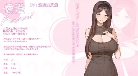 4、静子:与你相识多年的上司,年龄25岁,身高156cm,CV为芒穗果,东云企业的员工,主角的上司,平常展现出女强人的一面,偶尔会有些迷糊,非常的关心主角,身为主角的上司,总是在帮助主角收拾残局,这次静子透过一些关系替主角争取到了一个机会,经由时间的推进,发现了静子似乎对自己有好感,同时也意识到自己与静子相处起来的舒适感是让人放松的,静子的故事线围绕着'救赎'与'成长'展开。