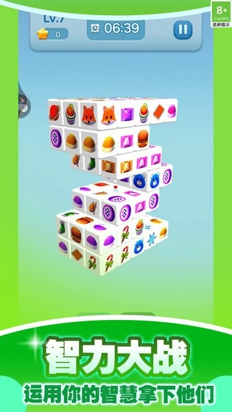 方块零零幺是一款创意十足的3D消消乐趣味闯关游戏,玩家在游戏里需要旋转屏幕中的大方块,找出相同图案进行消除。要是一时找不到相同图案,还能滑动屏幕、调整旋转角度来仔细搜寻。这种3D立体的设计,大大提升了游戏的挑战性与可玩性,能让玩家在方块零零幺中收获全新的游戏体验。此外,游戏的关卡十分丰富,绝对能让你玩得开心。在方块零零幺里,玩家还可以通过闯关收集星星,用星星兑换更多实用道具,助力自己取得更高分数呢。