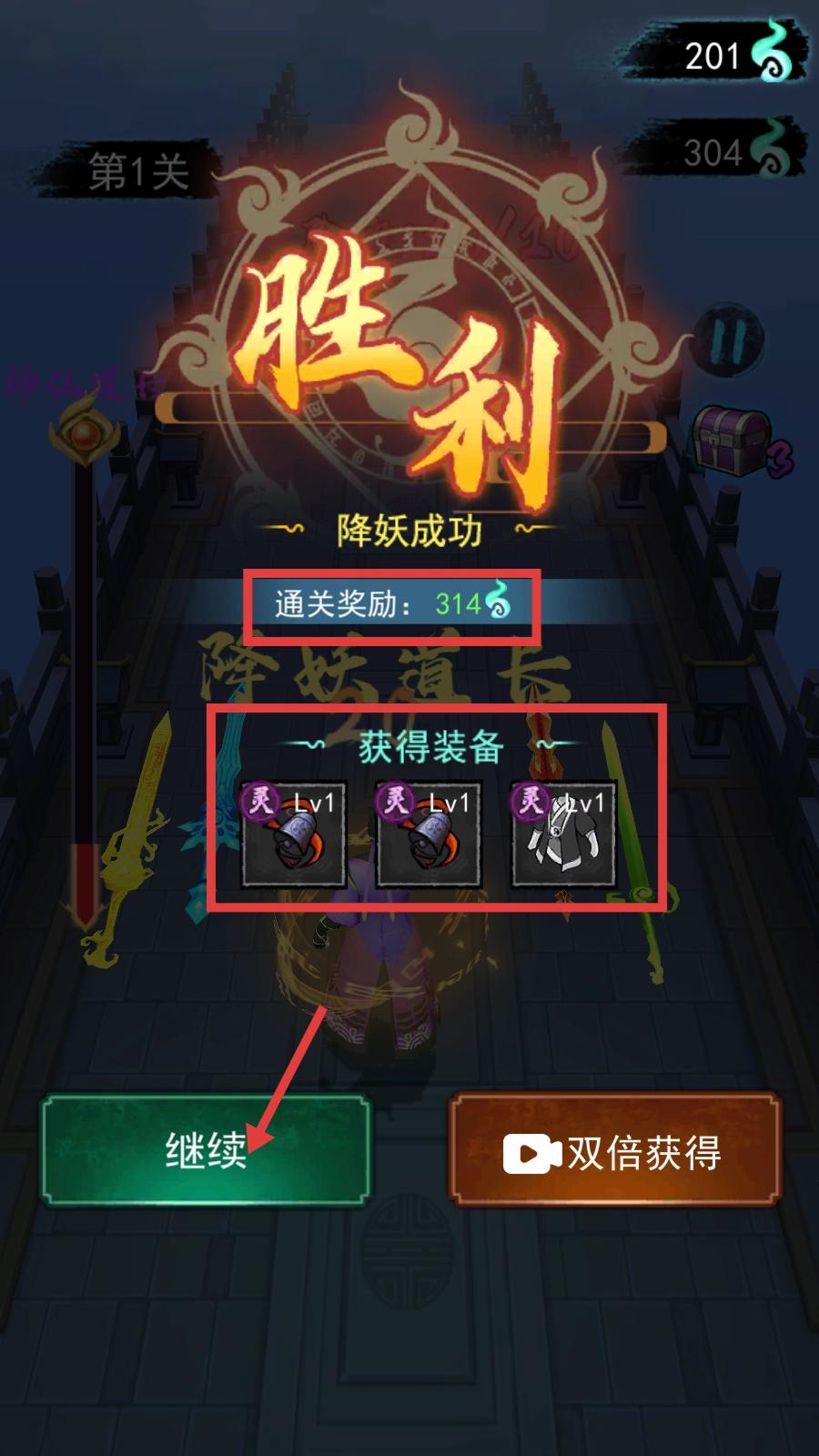 通关之后可以领取【314】资源与灵级装备,点击【继续】按钮就能开启下一场降妖挑战,通过积累资源来强化装备。