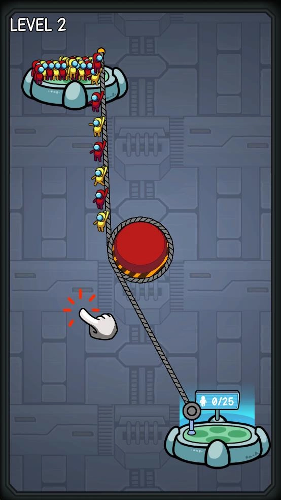 游戏开始时,先留意界面右侧手指所指向的黄色圆形开关,点击这个开关就能解开连接的绳索,从而构建出上方人群往下方转移的通道。