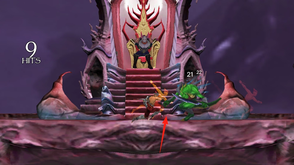 在战斗环节(红箭头标识),通过连续攻击达成9次连击(9HITS),成功触发连招机制,击败绿龙后积累combo值,进而挑战最终BOSS(王座上的角色),推动剧情向前发展。
