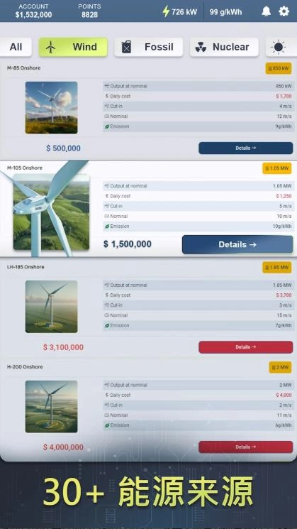 游戏包含太阳能、风能、水能、核能等可持续能源,此外还能选择煤炭、石油与天然气这类传统能源来进行发电。