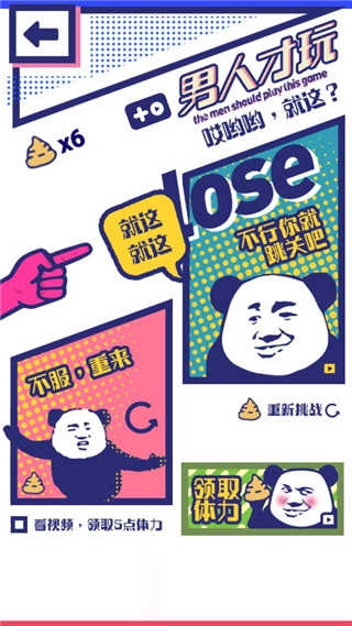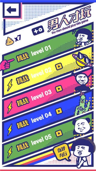 《男人才玩》是一款趣味十足的休闲游戏,画面风格搞笑诙谐,游戏里的角色全是大家熟悉的熊猫表情包,玩起来特别有意思。游戏的玩法也很简单:开始后玩家操控角色完成当前关卡,就能解锁下一关。随着游戏推进,关卡难度会慢慢提升,这时候就需要玩家动动脑筋了。不过每个关卡界面都有对应的小提示,大家可以仔细观察、认真分析,争取一次通过。要是没过关,游戏会显示“就这就这”,反而能激发你继续挑战的欲望;如果实在觉得难,也可以看提示帮忙快速通关,但还是建议自己尝试闯关,这样既能享受乐趣,通关后还能收获满满的成就感。另外,游戏里还藏着不少意外陷阱,玩的时候可得小心应对哦!喜欢这类游戏的玩家,不妨来《男人才玩》里体验一下吧!
