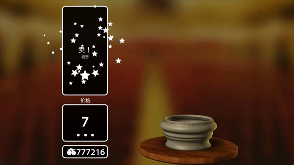 在成品界面点击右下角的拍卖图标,可以将作品拍卖。最开始的作品由于造型和装饰等都很简单,只能卖到几十元,而随着陶器的造型及上色等越来越复杂,价格也会飙升。看着自己辛苦制作的陶器卖出一个好价钱,既高兴又有些不舍。卖出陶器后,我们可以去商店购买颜料、装饰等,用来制作更加漂亮的陶器。
