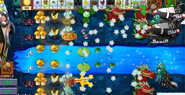 排山倒海:整列种植与融合植物,礼盒单位随机生成不同种类。僵尸仍按常规波次出现。