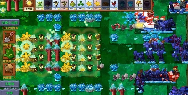 诸神玩法:初始配置固定植物阵容,无冷却手套实时调整站位。击败僵尸获取阳光资源,逐步强化防御体系。