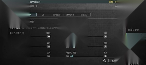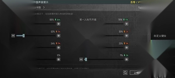 镜头灵敏度:第三人称不开镜66%,第一人称不开镜70%,红点/全息52%,2倍镜35%,3倍镜24%,4倍镜23%,6倍镜12%,8倍镜7%。