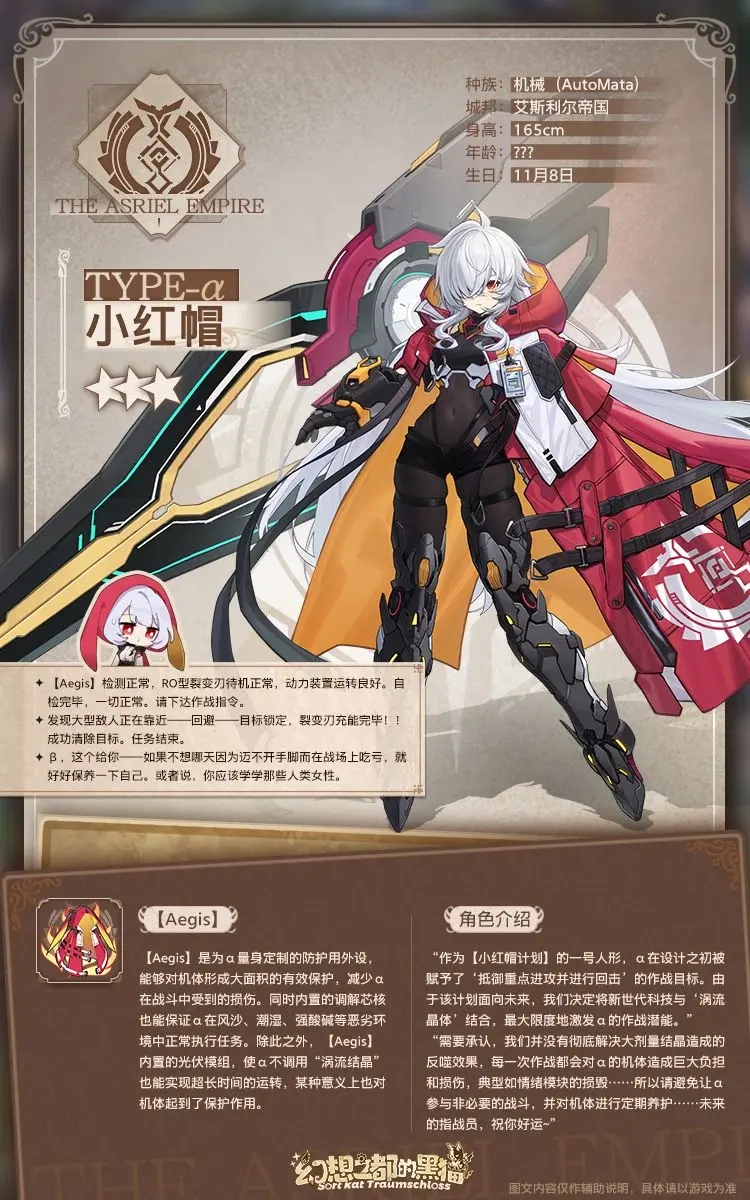 小红帽:作为小红帽计划一号人形,α设计用于抵御进攻并反击,结合新科技和涡流晶体。但每次战斗损伤机体,需避免非必要战斗。