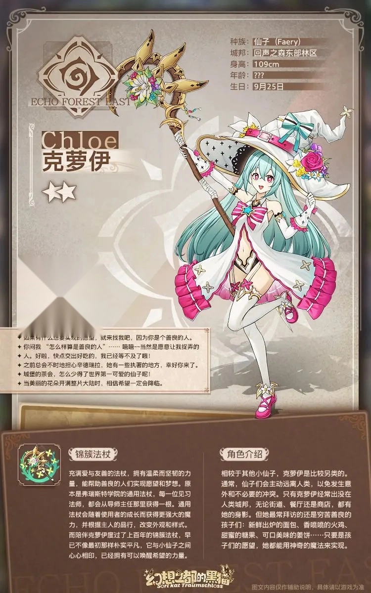 克萝伊:不同于其他仙子,常出没人类城邦,尤其帮助贫困孩子用魔法实现愿望,提供面包、糖果等食物。