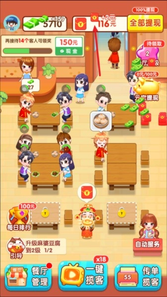 经营玩法简单轻松,点击即可接待顾客、升级饭店设施,红包福利实时发放,边经营店铺边领取奖励,轻松赚收益,饭店装扮自由搭配,装修升级打造风格独特的热门店铺,全中文界面操作简单,玩法直观,新手也能快速上手经营。