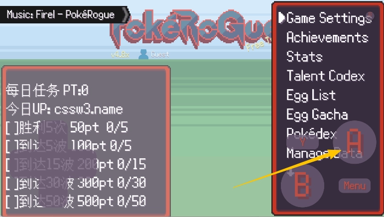 全文主题是B站up主自制且持续更新的手机版《宝可梦肉鸽》,将宝可梦与Roguelite元素融合,采用回合制战斗,战斗胜利可从随机奖励中选一个提升战力,宝可梦等级可突破100级上限;玩家可通过打开游戏点击Menu→Game Settings→Display→Language切换为简体中文;新手需用初始10个指数点选宝可梦,战斗前可换阵容,按C键查看能力涨跌,左上角显示道具和加成;游戏每次开局地图、敌人、奖励随机,收录第一至八代数百只宝可梦,部分进化方式魔改,有复古Game Boy像素风格,还含被动特性系统(糖果解锁,糖果来自亲密度)、宝可梦融合(种族值平均、继承双方特性)、扭蛋机系统(神兽等三卡池,抽奖券获取自每日挑战等)及经典模式、每日挑战、需通关经典模式或拿基因解锁的妖梦模式(100波战斗、商店无购买限制),v4.8修复版还修复了通关卡死等问题并调整了天赋数值。
