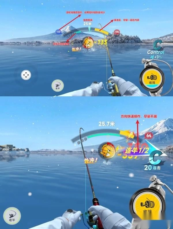 根据鱼类特性采用不同策略:潜水鱼需持续施压,挣脱型要控制张力指针在黄色区域,外冲鱼及时使用破空收线。连竿操作积累能量条,左右滑动保持连击节奏。