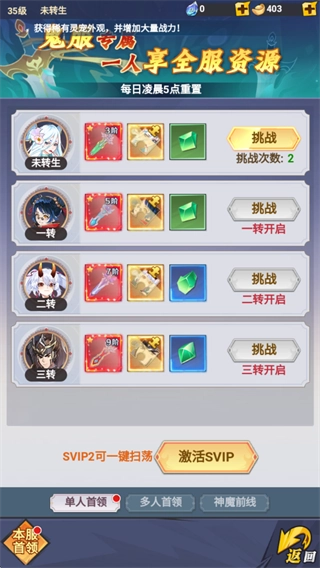挑战【单人首领、多人首领、神魔前线】等副本获取对应奖励,积累资源提升战力【SVIP2可一键扫荡】。