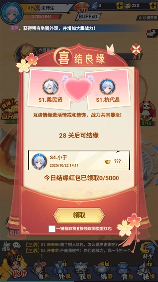 参与【喜结良缘】系统,可激活互结情缘激活情戒和情饰,战力共同暴涨,还能领取结缘红包。