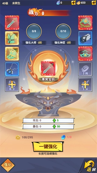 利用宝石和金币强化武器,提升攻击、暴击属性以增加战力。