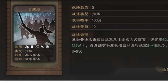普通攻击前对敌军单体造成兵刃伤害(伤害率62.5%→125%),自身拥有增益状态时提升9→18武力,最多叠加5次。