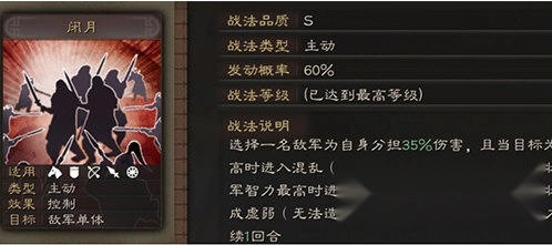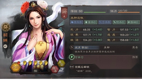 闭月发动率60%,针对目标特性控制稳定,分担伤害35%自保减伤。推荐学习战法:舌战群儒降低敌军主动战法几率;合军聚众或自愈每回合恢复兵力。其他可选出其不意、盛气凌敌等。