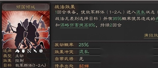 可拆战法倾国倾城:1回合准备,使1-2名敌军混乱,概率造成伤害提高8%持续2回合。