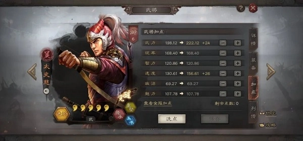 陆逊全加智力。孙尚香加速不影响输出,弓腰姬加成和胜战破阵保障伤害。太史慈速度155-160性价比高,156略快过孙尚香,优势:快过无先攻队伍;每回合先手拉开差距。