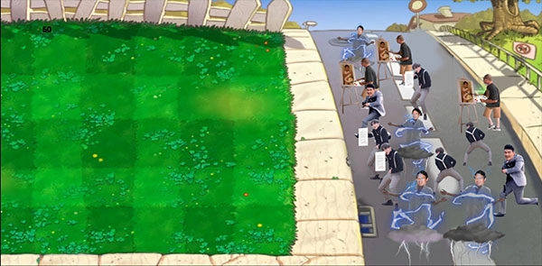 能看到熟悉的植物大战僵尸场景画面,不过不一样的是,右侧的僵尸全都变成了全明星。