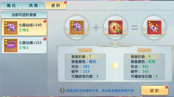 1. 选择装备点击“强化”,消耗铜钱提升等级。