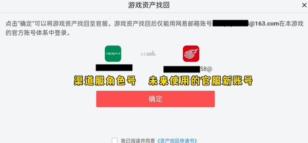 使用需要找回资产的OPPO渠道服账号登录,确认进入的角色是需要转移的角色后,点击【找回游戏资产】。