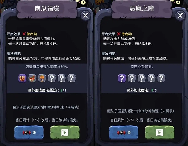 2、进入魔法乐园解锁“南瓜福袋”和“恶魔之瞳”功能,消耗魔法糖果开启这些增益效果。