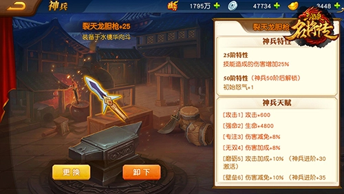 当神兵进阶到25阶与50阶时,能够激活神兵特性,使武将获取特殊的战斗能力。
