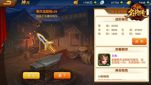 神兵进阶可提升武将攻击、防御、生命。