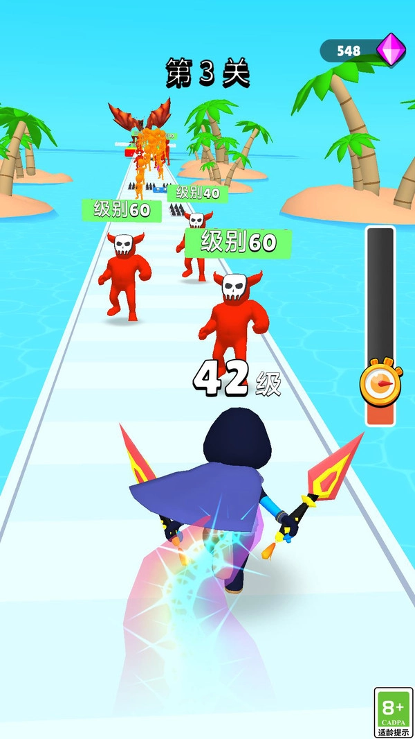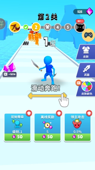 核心创新点在于把“高速移动”和“即时战斗”进行了完美融合。角色处于自动向前冲刺的赛道中,玩家需要操控角色进行左右移动、跳跃以及滑铲动作来避开障碍。 2、在前进的途中会遇到多种不同类型的敌人,像近战小兵、远程射手、持盾守卫、快速突袭者之类的都有。每一种敌人都有着不一样的攻击前摇和攻击范围。 3、通过战胜敌人和完成关卡可以得到金币、经验还有装备。经验能够用来提高角色等级,解锁被动属性方面的加成;金币则可以用于对主动技能进行升级。